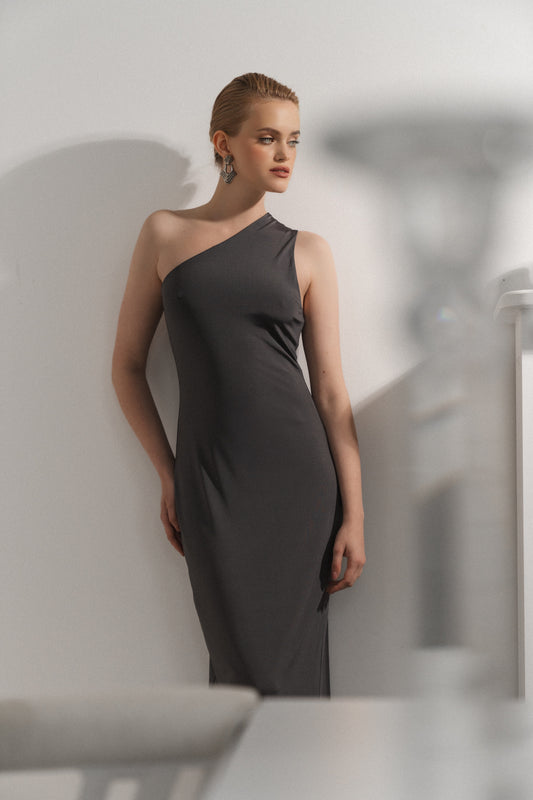 Satin-Midikleid mit einem Neckholder-Ausschnitt im Old-Money-Stil. Gefertigt aus hochwertigem italienischem Stoff. Eine taillierte Silhouette, mit schwarzem, satiniertem Finish und verdecktem Reißverschluss.
